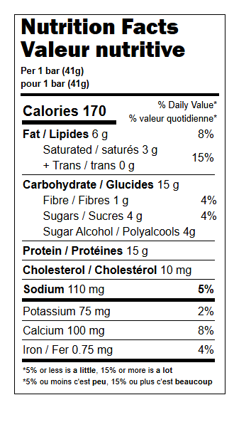 Ingrédients: Mélange protéique (isolat de protéine de soja, concentré de protéine de lait, caséine acide, concentré de protéine de lactosérum, isolat de protéine de lait), Glycérine, Sirop de maltitol et maltitol, Gélatine hydrolysée (boeuf), Arachides (7%), Huile végétale (palmiste modifiée, palme modifiée, tournesol), Sucre, Eau, Poudre de cacao, Arômes naturels et artificiels, Fructooligosaccharide, Poudre de lait écrémé, Mono- et diglycérides, Sorbitol, Pectine, Lécithine de soja, Crème, Sel, Phosphate de sodium, Gomme gellan, Carraghénine, Phosphate dicalcique, Tocophérols, Sucralose (10 mg par barre (42 g)).