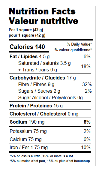 Ingrédients: Mélange de protéines (isolat de protéine de soja, concentré de protéine de lait, concentré de protéine de lactosérum, poudre d’albumen d’œuf, isolat de protéine de lactosérum), polydextrose (4 g par carré de 42 g), huiles végétales (palmiste modifiée, palmiste, palme, karité), eau, fructooligosaccharides, glycérine, sirop de fibre de maïs soluble, riz brun, sucres (sucre, sirop de riz), amidon de tapioca, amidon de riz, arômes naturels et artificiels, poudre de yogourt (lait, cultures bactériennes), poudre de lait écrémé, agar, sel, lécithine de tournesol, carbonate de calcium, sucralose (13 mg par carré de 42 g), amandes, tocophérols, lécithine de soja.
