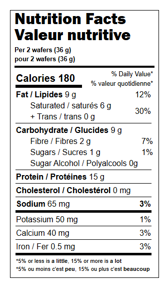 Ingrédients: Mélange de protéines (caséine acide, gélatine hydrolysée de bœuf, isolat de protéines de lactosérum, concentré de protéines de lait, concentré de protéines de lactosérum, isolat de protéines de pois), huiles végétales (huile de palme modifiée, huile de palmiste, huile de karité, huile de tournesol), eau, farine de blé, polydextrose (2 g pour 2 gaufrettes de 36 g), liqueur de cacao, arômes naturels et artificiels, sucres (fructose), lécithine de soja, poudre de cacao à faible teneur en matières grasses, mono- et diglycérides, fibre de bambou, farine de maïs, farine de soja, sucralose (46 mg pour 2 gaufrettes de 36 g), sel, bicarbonate de sodium.