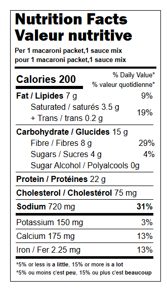 Ingrédients: Pâtes (isolat de protéine de pois, isolat de protéine de blé, amidon de blé modifié, inuline, jaunes d’oeuf en poudre, phosphate de sodium, acide lactique), Préparation pour sauce au fromage (fromage cheddar, lactosérum, babeurre, sel, extrait de levure, maltodextrine, amidon de maïs modifié, huile de tournesol, gomme de guar, gomme xanthane, poivre blanc, carotène (colorant), paprika (colorant), arôme naturels, acide lactique, phosphate de sodium, dioxyde de silicium, triglycérides à chaînes moyennes, tocophérols).