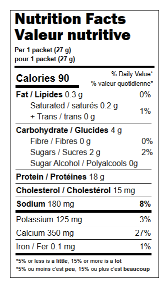 Ingrédients: Concentré de protéine de lait, Isolat de protéine de lactosérum, Produits laitiers en poudre (maltodextrine, lactosérum, crème sure, lait entier, yogourt écrémé, lait écrémé de culture), Fruits deshydratés (bleuet, fraise, framboise), Sel de mer, Arômes naturels et artificiels, Acide citrique, Gomme xanthane, Sucralose (57 mg par sachet de (27 g)), Dioxyde de silicium.